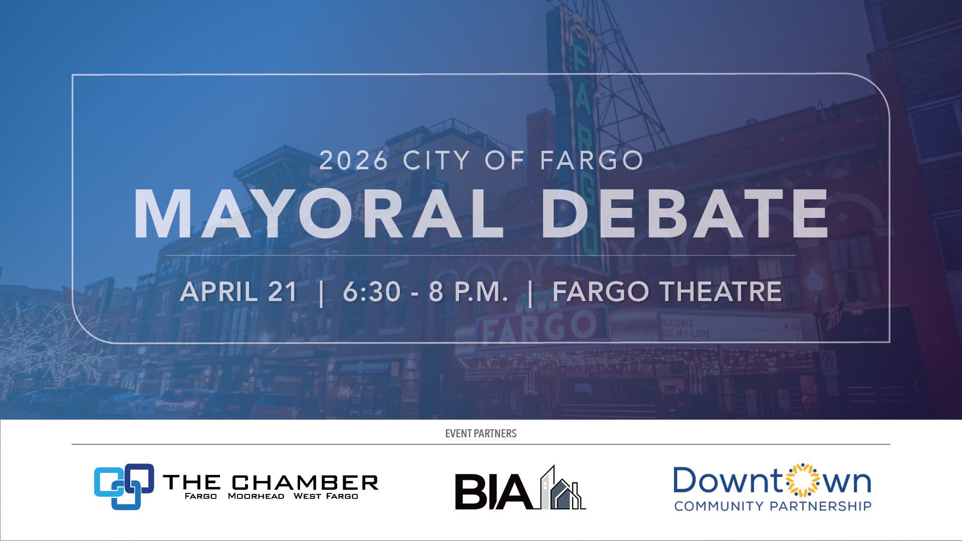 DESCRIPTION:As the City of Fargo prepares to elect its next mayor\, this debate brings together the candidates seeking to lead the city at a pivotal moment for growth\, development and long-term planning. Hosted by the Fargo Moorhead West Fargo Chamber of Commerce\, the Building Industry Association of the Red River Valley and the Downtown Community Partnership\, this event creates a structured\, nonpartisan environment for candidates to share their perspectives on the issues shaping Fargo's future. Attendees will hear directly from each candidate through opening and closing remarks\, moderated questions and a rapid-response round designed to highlight priorities\, decision-making and leadership approach. Topics will reflect key areas impacting the business community and broader region. This is an opportunity for business leaders\, residents and stakeholders to better understand where each candidate stands and how they plan to lead Fargo forward. The debate will be held at the historic Fargo Theatre and will follow a formal format to ensure fairness\, consistency and equal opportunity for all participants.Additional event details will be released once the official candidate filing period has closed. \nCo-Hosts \nBroadcast Partner\nEvent Production Sponsor